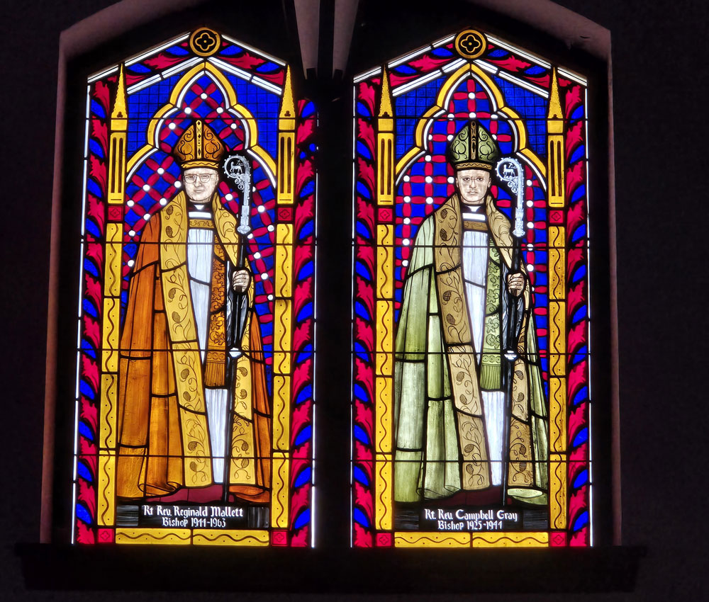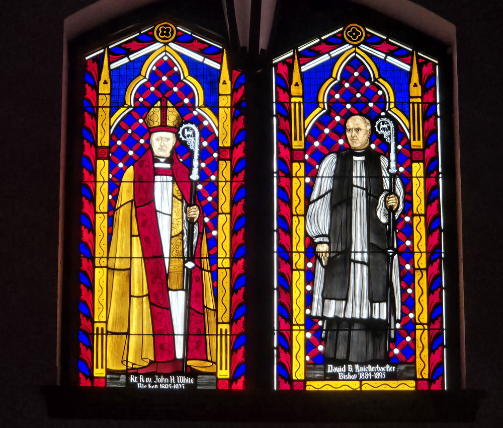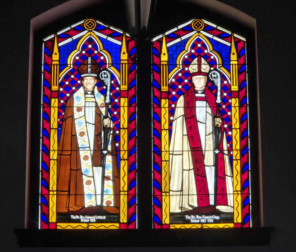 Deacon George Douglass ’60 has observed that some of the bishops portrayed in the stained glass windows in the north side of the nave are pictured wearing non-liturgical (e.g. brown) copes, an unlikely behavior for an anglo-catholic.