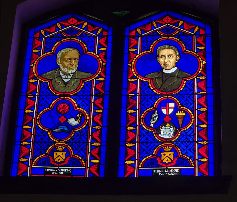 Stained-glass windows were originated in the Middle Ages to tell the Bible stories in pictures. The nave windows in St. James Chapel tell the School’s history in pictures. Craig Buskirk 1970 took these photos of the nave windows. The north-side windows show the Episcopal bishops who chaired the Board; the south-side windows show the founders and benefactors.