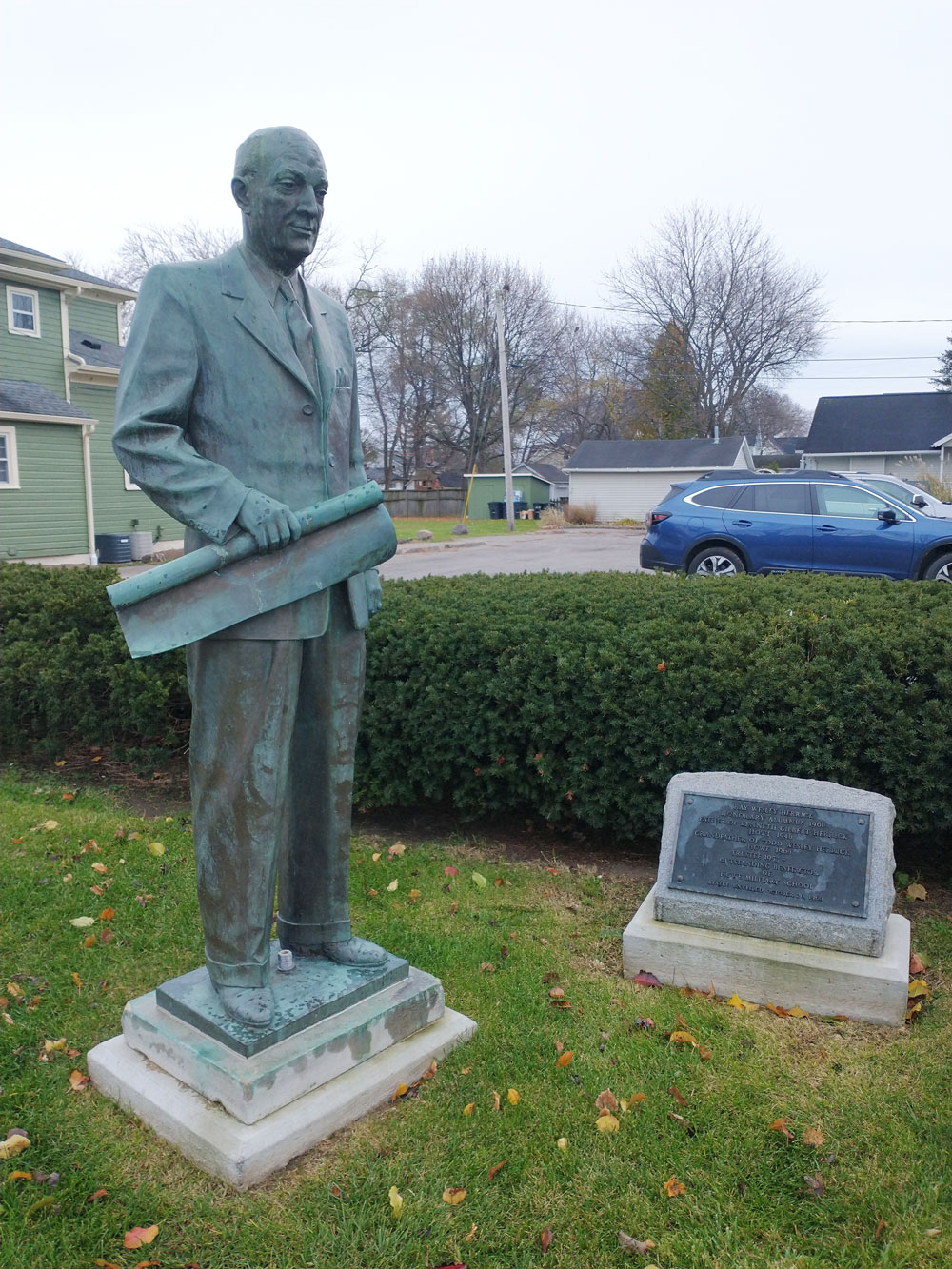 This statue of Ray Herrick stood at the entrance of the Herrick Administration Building on the HMS campus until our School closed in 2019. It was then moved to Tecumseh, MI, and is located at 42° 0.238′ N, 83° 56.5′ W.