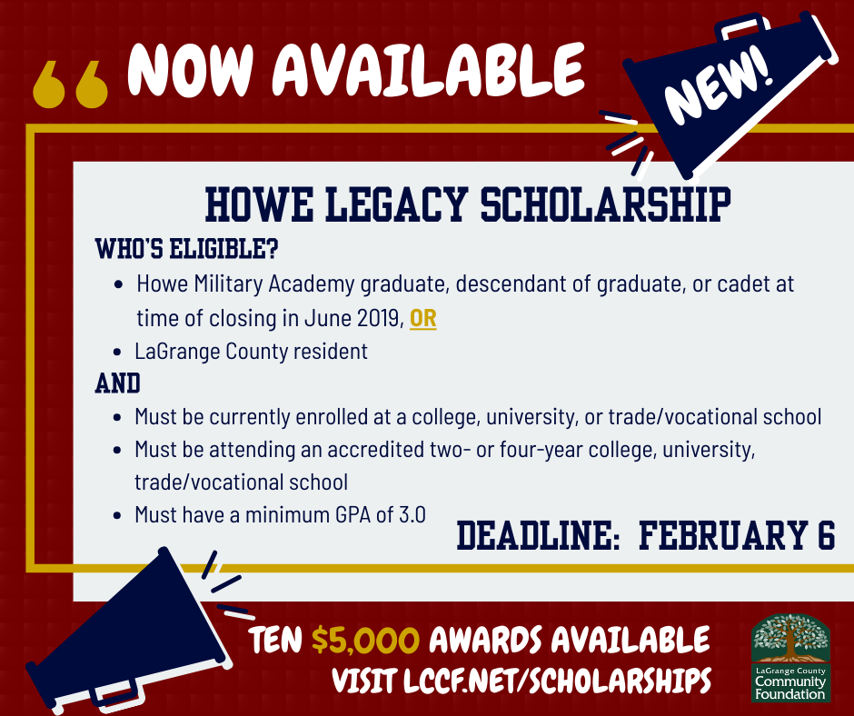 While preference will be given to applicants with ties to Howe Military, the Foundation encourages all eligible LaGrange County post-secondary students to apply.