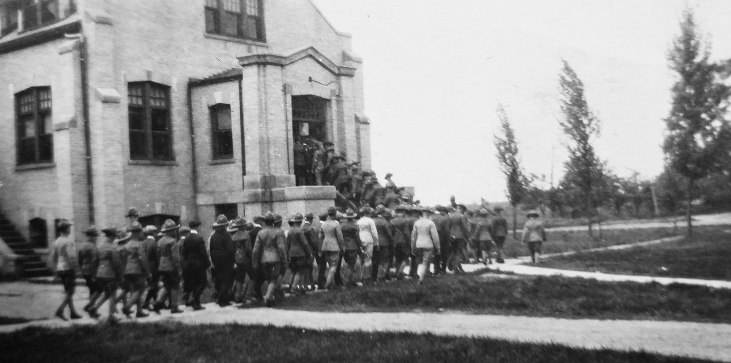 The Middle School cadets on the steps of Howe Hall in 1917. The yellow brick porch came in the 1920s.